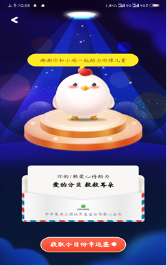 文化产业管理1901团支部的张晨阳活动期间在支付宝蚂蚁庄园捐蛋做公益活动,为听障儿童送上了一颗鸡蛋。