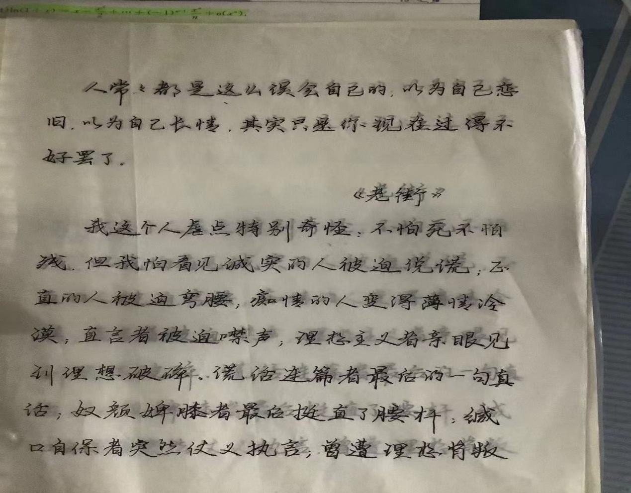 “书法需要的是耐心和持久的坚持,因此在练习书法可以修心养性,提升自己素养。练习书法,不仅陶冶了我们的情操,增强了我们的耐性,还学会了虚己待人的处世态度。练字在陶冶我们情操的同时,也让自己学习之余的生活更加充实。学习书法要勤奋,贵在坚持,书法没有捷径可走,字都是一笔一划写出来的,只要坚持练习下去,一定的时间之后才能有所成绩,不要想着立竿见影,一步登天。这次临摹字帖,我希望我能够持之以恒,努力将书法练习融入我的生活”