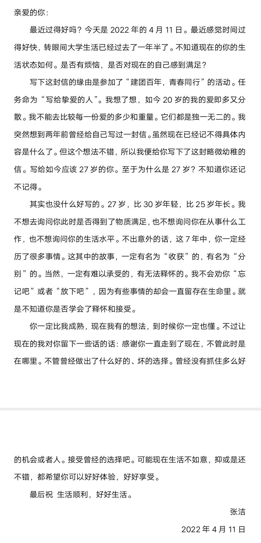 在信中,张洁对挚爱的人说:“不出意外的话,这7年中,你一定经历了很多事情。这其中的故事,一定有名为‘收获’的,有名为‘分别’的。当然,一定也有难以承受的,有无法释怀的。我不会劝你‘忘记吧’或者‘放下吧’,因为有些事情会一直留存在生命里,只是不知道你是否学会了释怀和接受。”她表明:“感谢你一直走到了现在,不管此时在哪里,不管曾经做出什么好的或坏的选择,曾经没有抓住多么好的机会或者人,接受曾经的选择吧。可能现在生活不如意,亦或是还不错,都希望你可以好好体验,好好享受。”信不长,却能让我们感受到张洁的深思与诚挚。