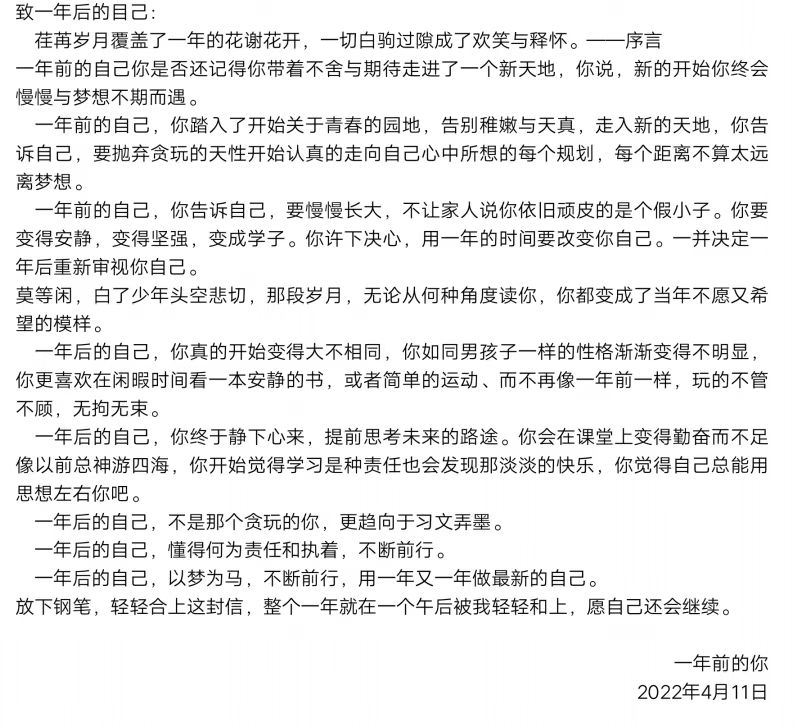 旅游管理2102团支部的赵琪琪给一年以后的自己写了一封信,希望在未来一年中的自己能够有所提升,她这样写到:“共青团的百年是艰辛、充满挑战的,跟随党的步伐,向着中华民族的伟大复兴道路高歌猛进,弘扬着五四爱国精神,续写着先辈青春奋斗新篇章。少年强则国强,少年智则国智!青年者,国之魂,青年是富有理想和朝气,是祖国的未来,是民族的希望。身为新时代新青年的我们,不应虚度光阴、碌碌无为,要在美好的青春年华去奋斗、去拼搏,绽放属于我们的时代光彩。身处在这个繁荣祥和时代,我们是幸运和幸福的,因此我们不应贪图享乐,要时刻谨记着我们历史使命和社会责任,要为中华民族的伟大复兴而奋斗,要继承并弘扬五四爱国精神。”