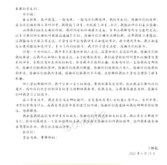旅游管理1901团支部的丁鹏超同学手写了一封感谢信,他选择了大学生活中朝夕相处的室友,对室友日常生活中的帮助致以感谢。室友或许是大学生活中最为亲近的伙伴,相遇于大一,但这份友情没有终点可言。大一初次见面时的稚嫩与青涩,再到后来室友之间的相互熟悉与了解,直至现在的朝夕相处,互帮互助。他说道:通过这次写感谢信的经历,我对感恩有了更深层地感悟,这次给室友写感谢信,感谢他们这几年的陪伴和这些年来给我带来的欢乐,感谢他们让我感受到大学生活的美好。作为大学生活中最为亲近的人,我却很少对他们表达感谢,因此借着这次机会对他们表示我真心的感谢。”当然,一点一滴都会有所收获,丁鹏超同学也有所收获,也对未来自己的人生原则注入新源泉。