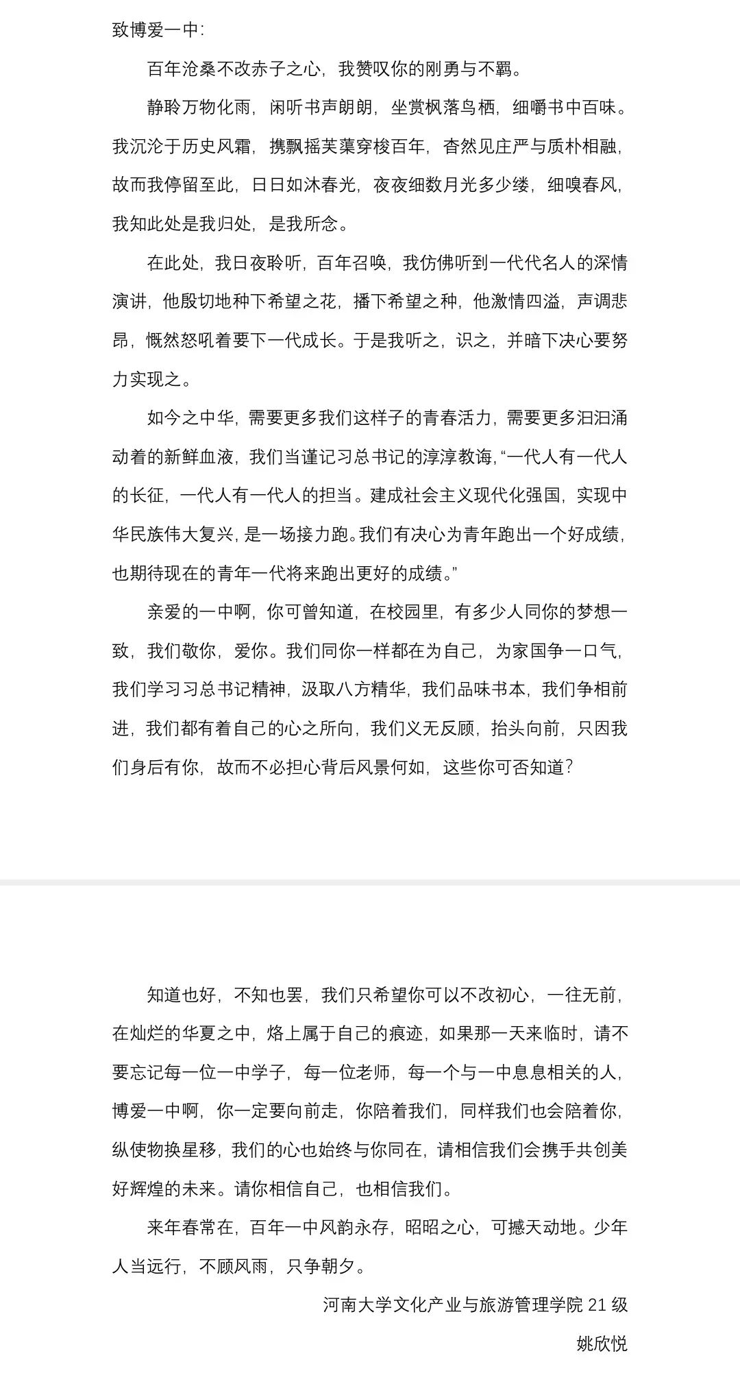 旅游管理类2103团支部姚欣悦同学借此机会选择为自己的母校写一封信,以此来表达母校对自己的教育之恩。在写信的过程中,我们可以进一步加强对自己学校的了解,在一次次的探寻之中,逐渐感受到了母校的魅力,再一次沉浸在母校的氛围之中。