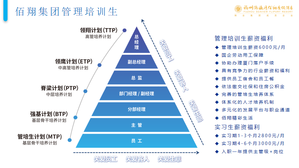 管培生项目是佰翔酒店集团“以培养公司末来管理者〞为主要目标的特殊人才发展项目。应届大学生通过轮岗培训、督导技能培训、岗位见习主管培训、导师制等方式,从基层快速成长,通过在伯翔酒店集团螺旋式的职业晋升通道来实现个人职业生涯的发展。目前已招收 11 届,在职 90人,其中分部门经理及以上管理人员占比88%