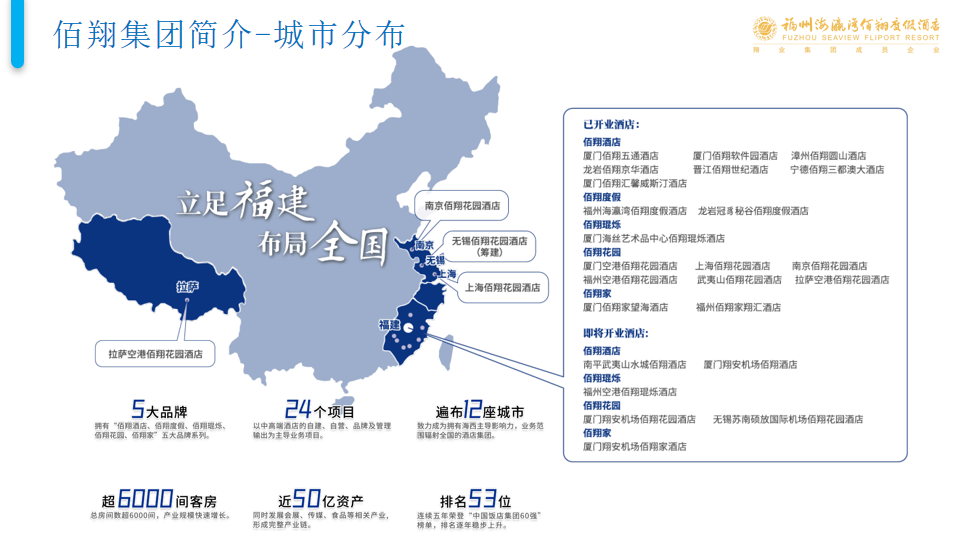 福州空港佰翔酒店群,隶属于厦门翔业集团旗下佰翔酒店集团,位于福州长乐国际机场区域,由3家酒店共同组成,分别为五星标准的福州海瀛湾佰翔度假酒店、四星标准的福州空港佰翔花园酒店、长租公寓型的福州佰翔家翔汇公寓。三家酒店客房数量共计1,090间,拥有大床房、双床房、家庭房、套房等多种房型,为不同出行人群提供多样化选择。