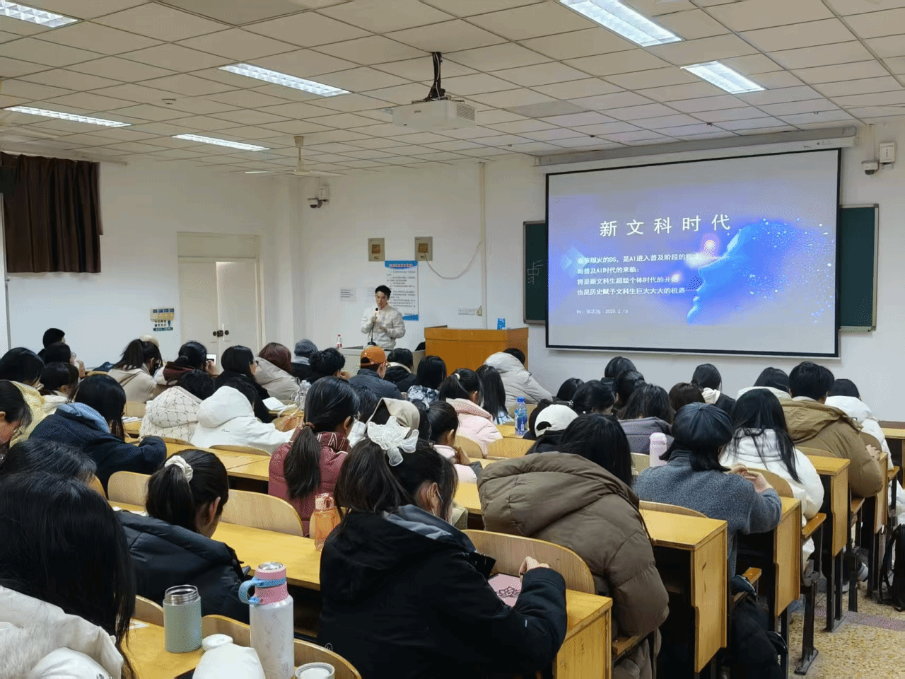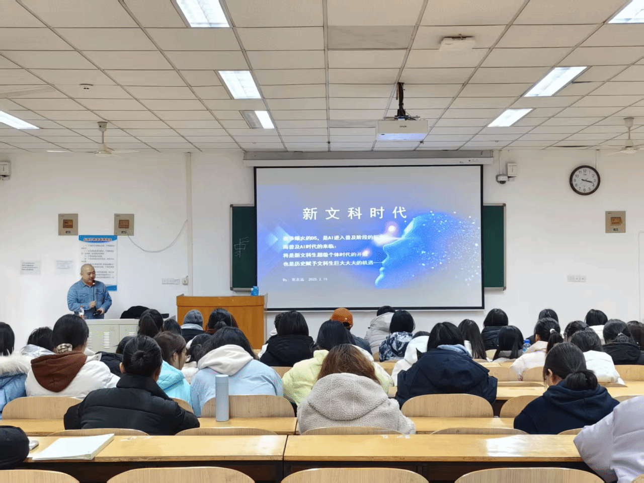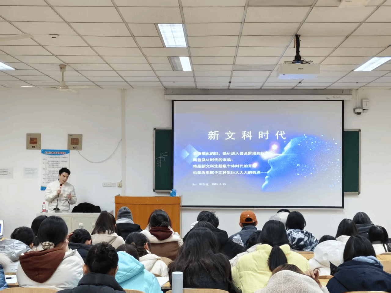 在讲座环节,张志远校友以“新文科时代:普及AI时代来临后,文科生的历史机遇”为主题进行报告分享。他指出,春节期间AI领域的重大变革标志着其进入普及阶段,为新文科生带来了成为超级个体的时代机遇。新文科生应具备横向技能宽、核心能力多的特质,将现代信息技术融入传统学科学习,掌握AI应用的核心能力,如提问、思辨、通用融合领域视角以及讲故事的能力,以避免在时代发展中被淘汰。