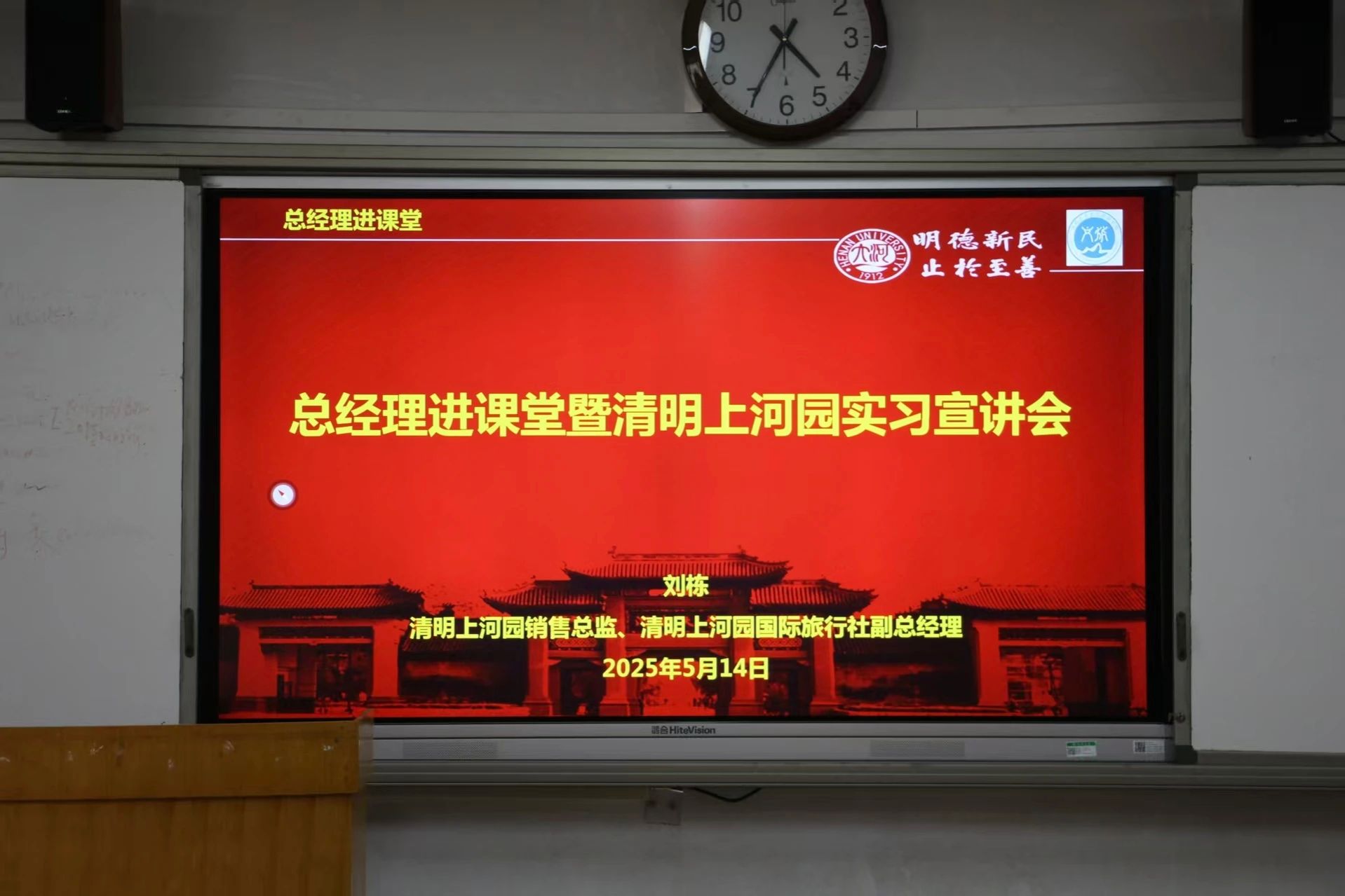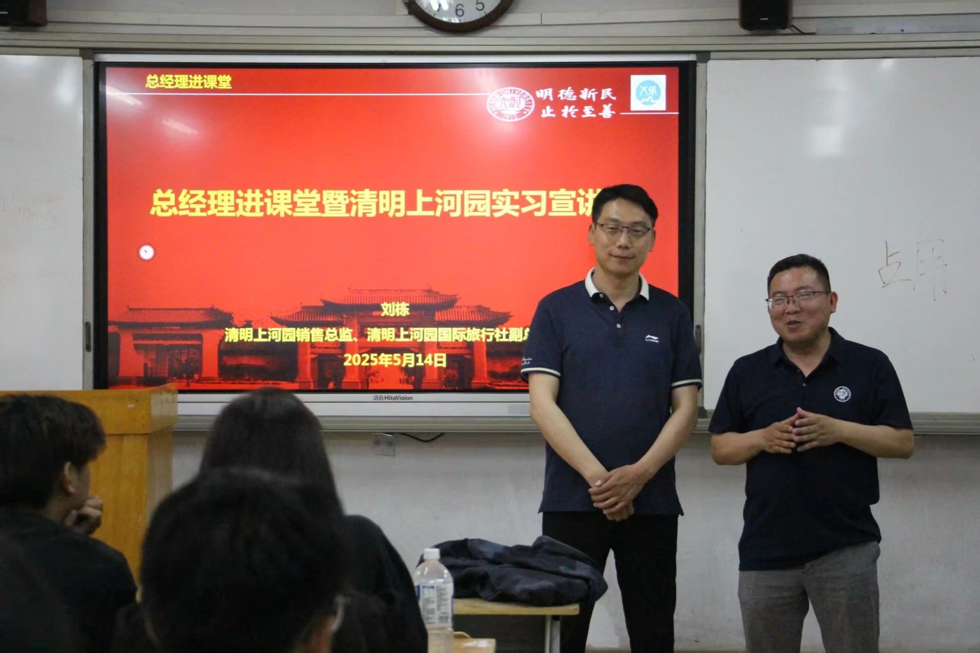 为深化产教融合,赋能学生职业发展,5月14日下午,beat365在综合楼501教室举办“总经理进课堂”暨专业实习宣讲活动,特邀清明上河园销售总监、清明上河园国际旅行社副总经理刘栋走进校园,与师生共话文旅行业实践与人才培养。活动由学院副院长张召鹏主持,党委副书记刘英钦、相关专业师生代表共同参与活动。